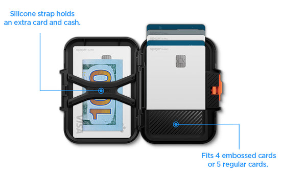 - Fits up to 5 embossed cards or 6 regular cards with strap for cash