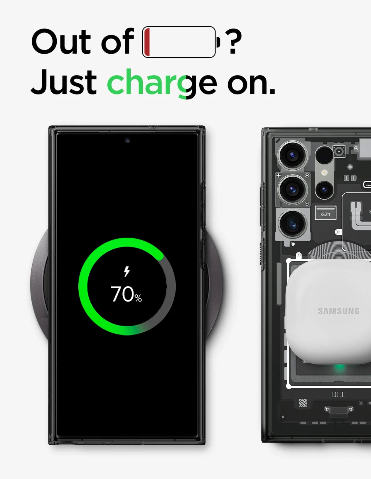 We know it's a hassle to take the case off. So, simply charge on with the case on. Spigen cases are compatible with wireless charger.