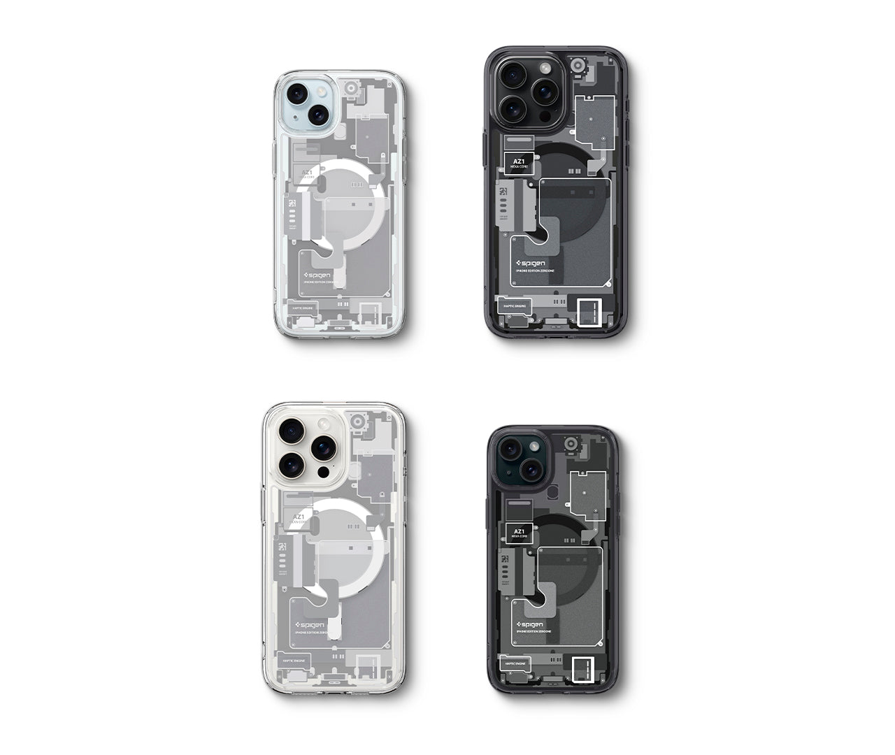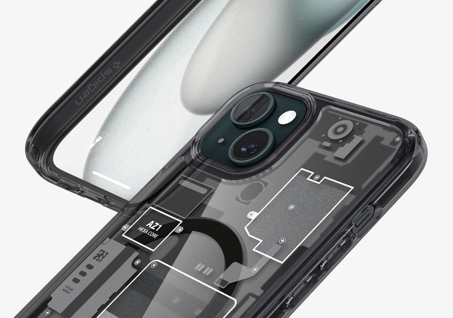 Unique teardown print highlights the sleek internal design of your iPhone 15 Series.