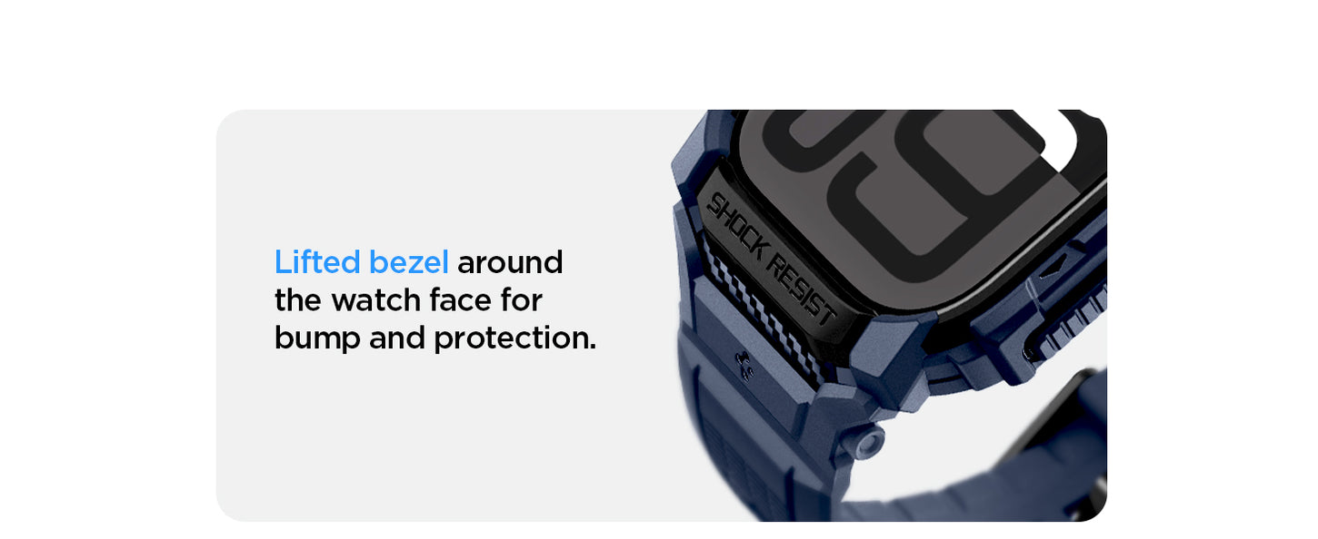 Rugged both inside and out. The Rugged Armor® Pro comes in a uni-body frame that includes an adjustable band with a protective cover for the watch. Made of a flexible yet durable material, the case handles all unwanted impact while staying extremely easy to put on and remove. Rugged Armor Pro bears all Watch compatibility in mind working with all the Apple Watch Series. Bolster the watch with defense with the all-new Rugged Armor® Pro.