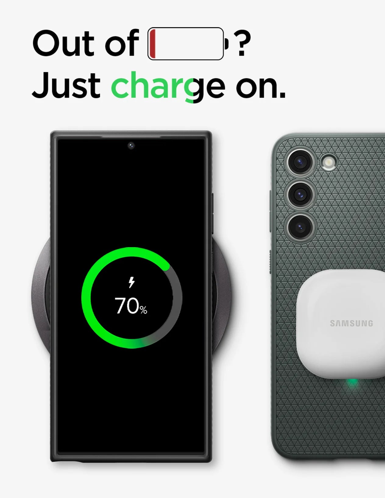 We know it's a hassle to take the case off. So, simply charge on with the case on. Spigen cases are compatible with wireless charger.