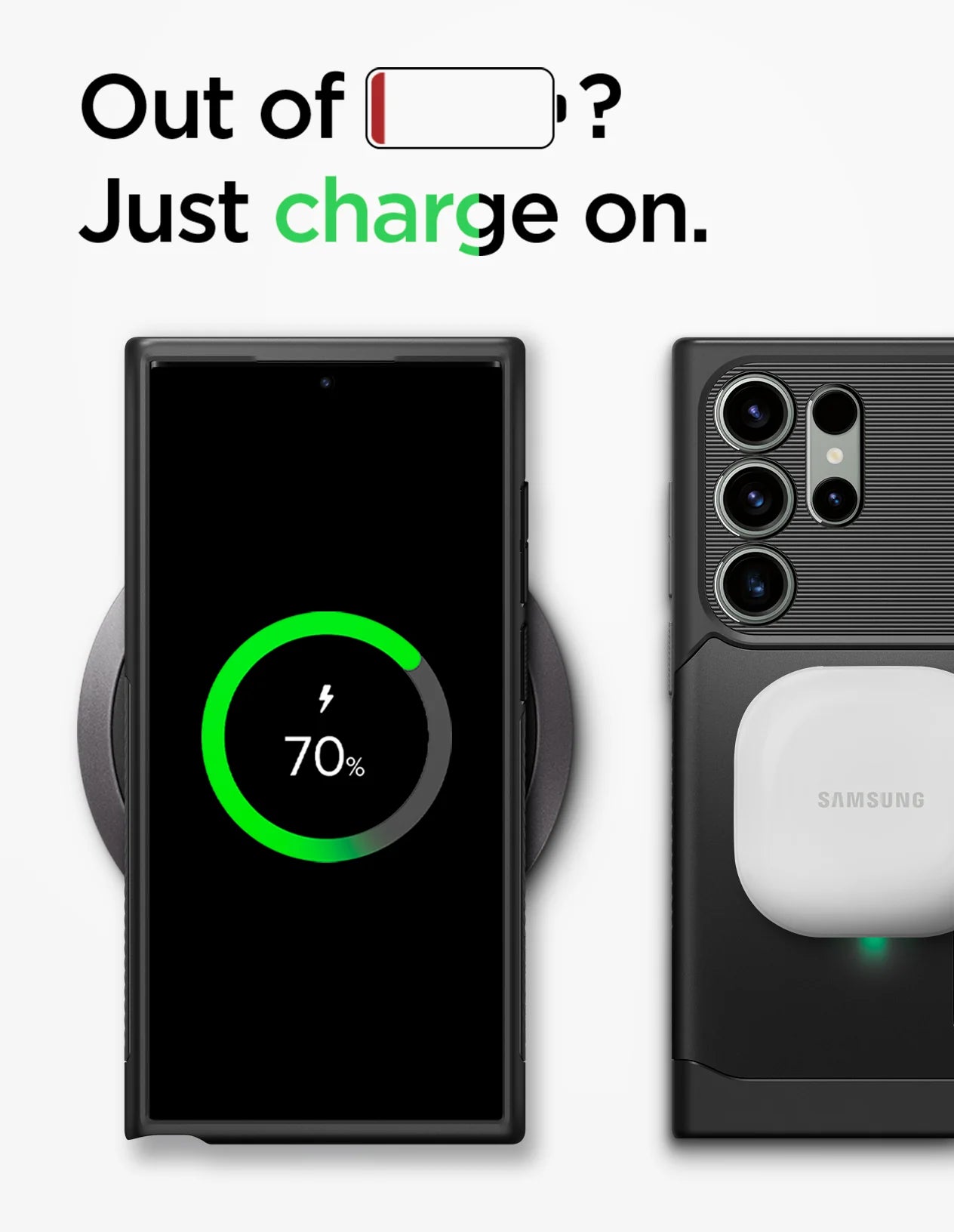 We know it's a hassle to take the case off. So, simply charge on with the case on. Spigen cases are compatible with wireless charger.